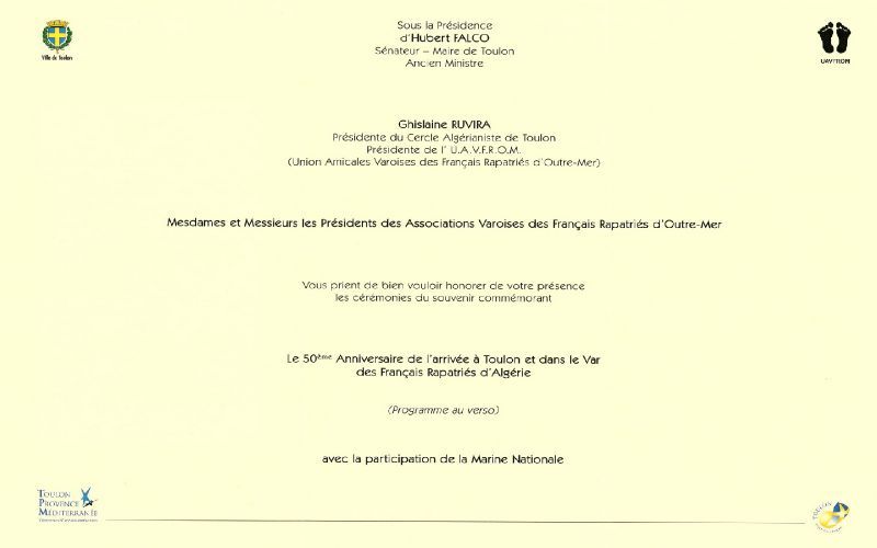 - Samedi 23 Juin, 15h, Auditorium hôtel Novotel ATRIA (à proximité des arènes) – 5, bd de Prague – 30000 NIMES – Thème : « Il y a 50 ans… L’Exode » - Conférence donnée dans le cadre du cinquantenaire organisé par la ville de Nîmes – Entrée gratuite – Renseignements : 04.66.27.76.80