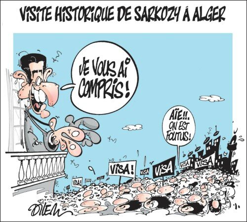 Caricature algérienne. Visite de N. Sarkozy en Algérie du 3 au 05.12.2007. Il avait été précédé par J. Chirac qui était en Algérie du 2 au 04.03.2003. Quant à F. Hollande, il a entendu les mêmes doléances à propos des visas...Mais Chut! La censure...