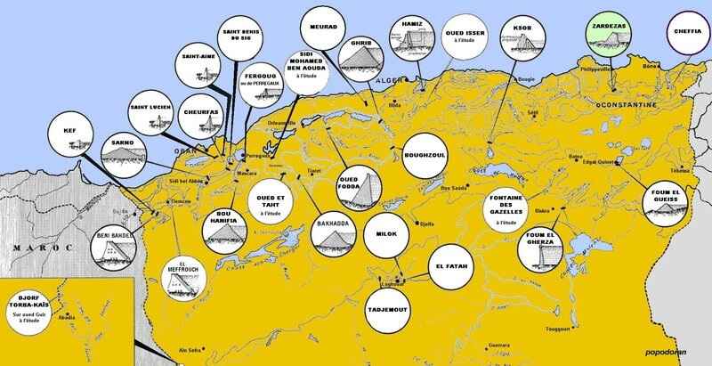 - les barrages réservoirs : en 1900 il en existe sept , cinq dans l'Oranie et deux dans l'Algérois ce sont : le barrage du Tlela, 1869-I870 d'une retenue de 730 000 m³, le barrage de l'Oued Magoun, 1879-1887 d'une retenue d'un million de m³ d'eau saumâtre ; le barrage des Cheurfas construit en trois étapes : en 1849 un premier mur retient 3 millions de m³ puis en 1880-1882 est édifié en amont un second mur plus haut , enfin suite à une rupture , le premier mur est rétabli et agrandi en 1886-1892 ; ces murs permettent une retenue totale de 18 millions de m³ ; le barrage de l'Oued Fergoud 1865-1873 retient 30 millions de m³ ; le barrage de la Djidiouïa 1875-1876 retient sept cent mille m³ ; le barrage de Meurad retient huit cent mille m³ ; enfin le barrage du Hamiz 1869-1894 retient 23 millions de m³ (capacité du réservoir en 1960). Ces ouvrages ne sont pas très hauts mais longs , souvent en terre parfois en béton , ou encore partie en béton partie en terre