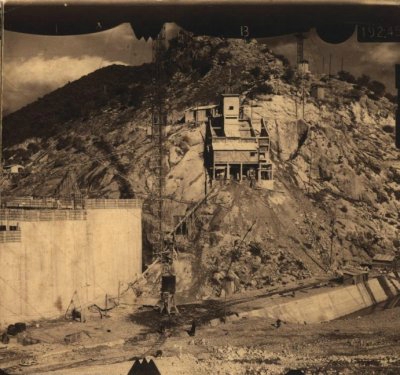 Barrage en construction, côté rive droite - centrale à béton -