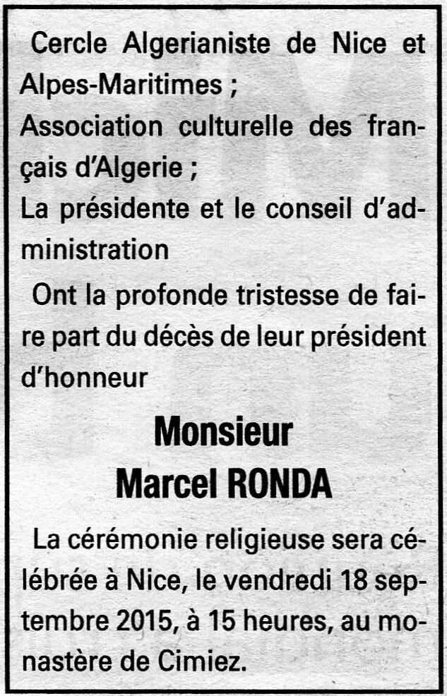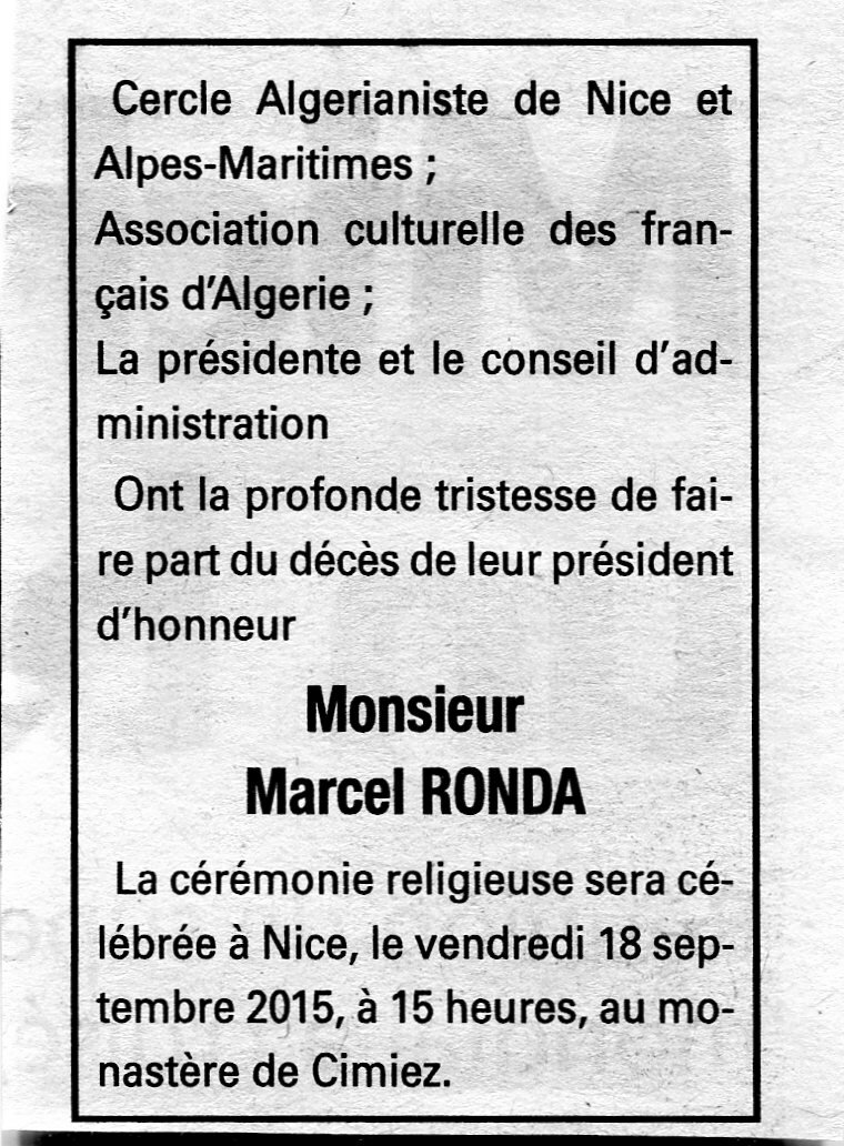 Amis Pieds-Noirs et sympathisants, de Nice et des Alpes-Maritimes, soyez nombreux pour lui rendre un dernier hommage, en vous rendant à la chapelle du Monastère de Cimiez, demain à 15h00.