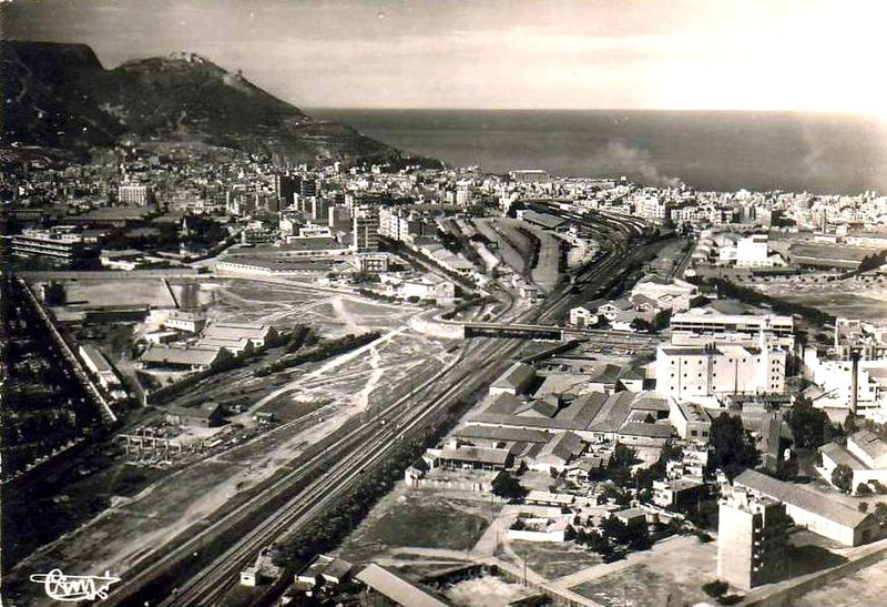 On aperçoit à gauche une partie du cimetière, le stade du rail, et le train abandonné où nous allions jouer, au centre le boulevard Hippolyte Giraud avec les immeubles Pédotti et le pont Henri-Huc, à droite la brasserie algérienne.