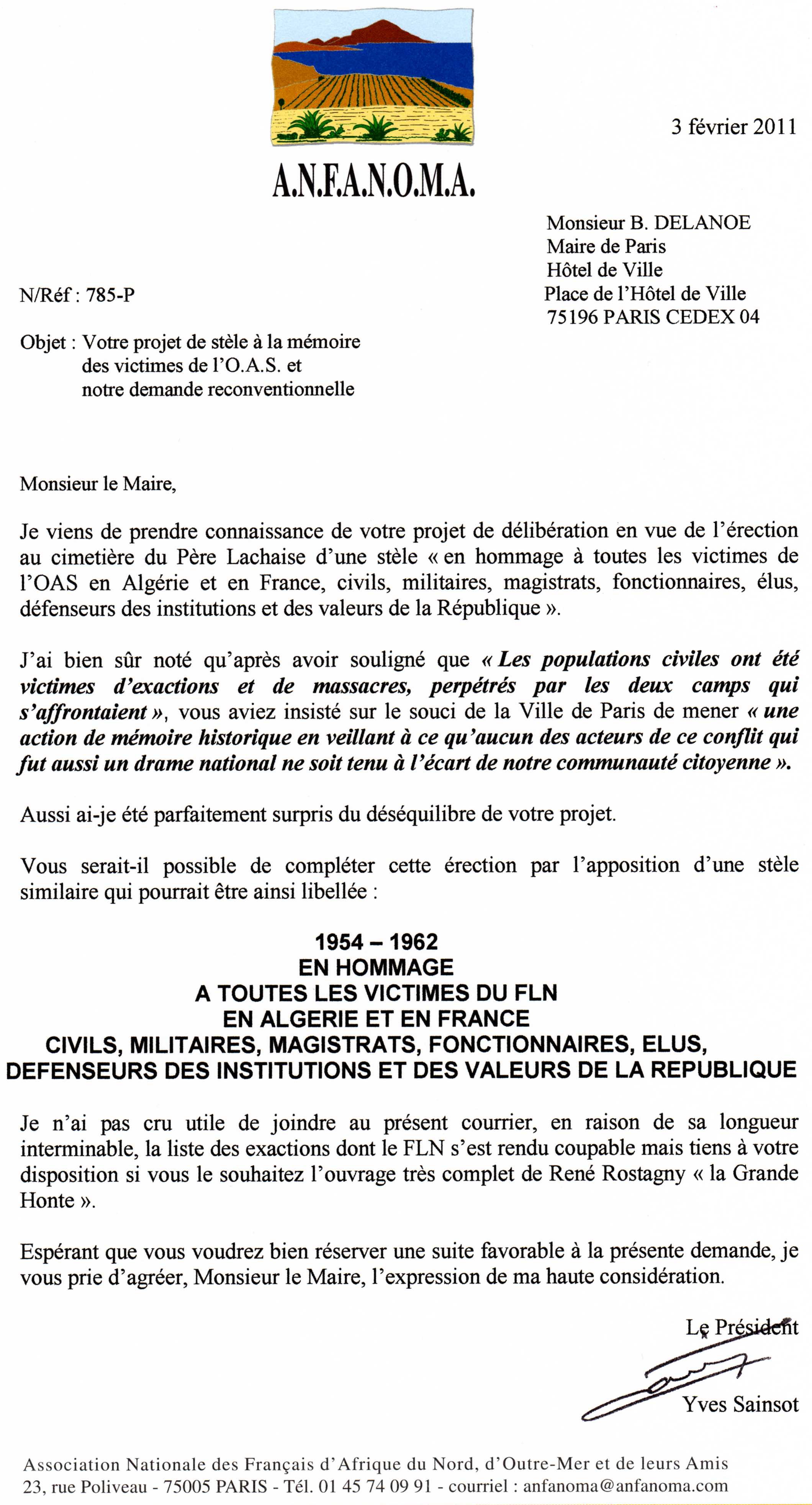 Mais non ! L'ANPROMEVO veut tout : le beurre et l'argent du beurre. Et comme, certainement, son président ne conçoit pas un vulgaire cimetière de Province pour honorer ceux qui ont combattu contre les intérêts des vrais Français d'Algérie, il s'adresse au plus islamophile des maires de France, le socialiste Bertrand Delanoë, qui dispose de l'argent de ses concitoyens pour le jeter par les fenêtres.