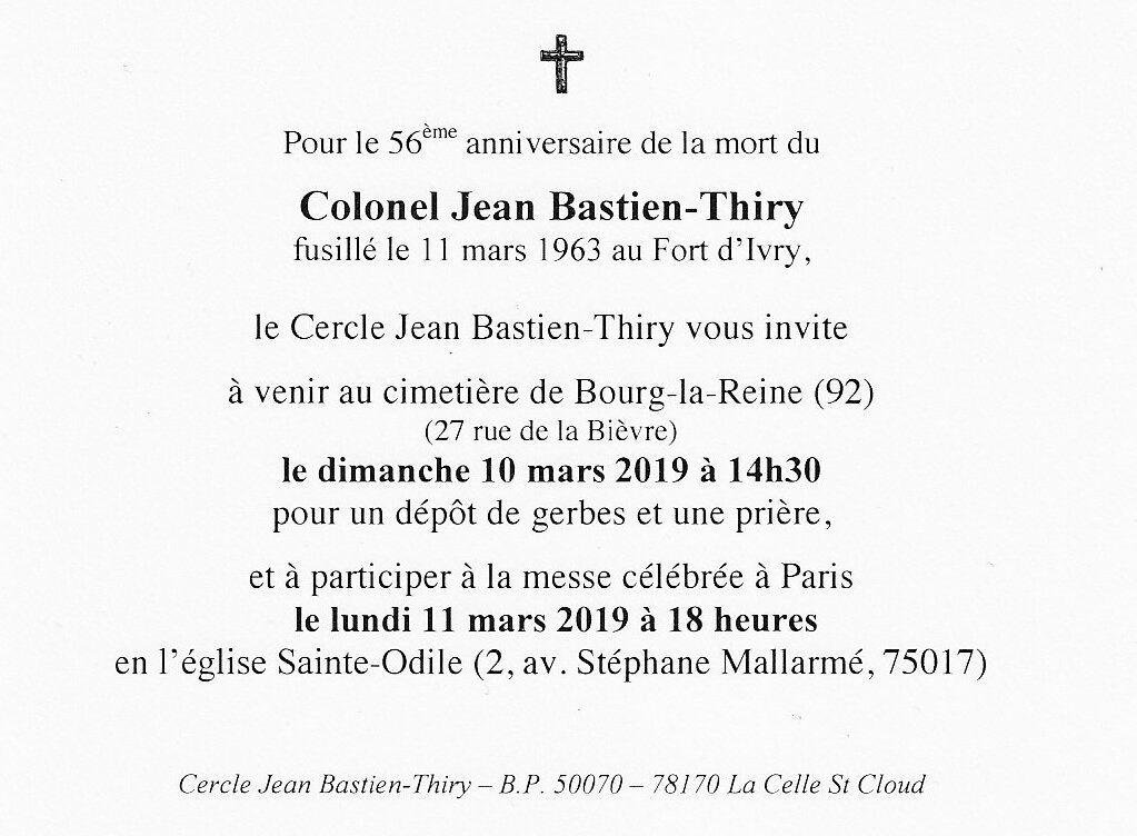 Merci de bien vouloir diffuser. Avec toute notre reconnaissance pour votre fidélité au souvenir de Jean Bastien-Thiry,
