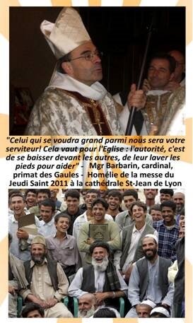 Tout aussi affligeante, cette conduite –pour le moins scandaleuse- de l’archevêque de Lyon, le cardinal Philippe Barbarin, prince de l’Église et primat des Gaules, qui, à l’occasion d’une conférence prononcée dans la cathédrale de Versailles le 4 janvier 2011, s’est vanté d’avoir appris par cœur la chahâda pour la réciter au chevet des musulmans mourants.