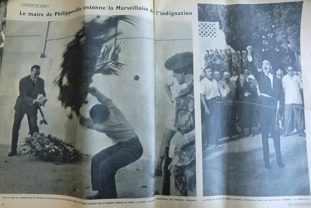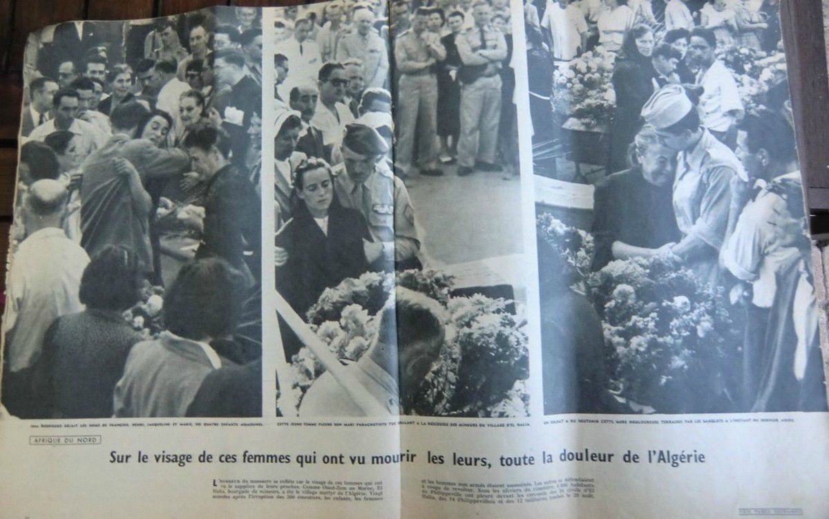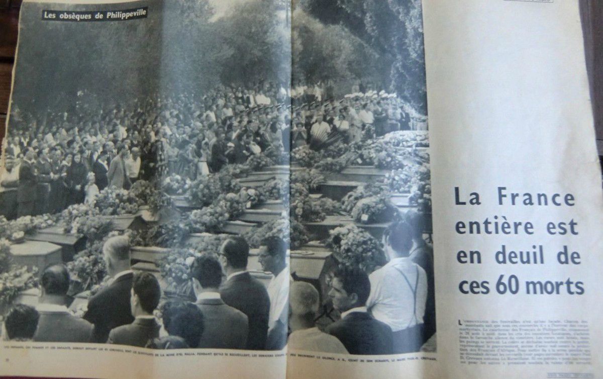 A Philippeville, lors des obsèques, c'est l'incident qui résume toute la situation. Soustelle, qui s'est repris, à El.Halia il était retourné, au bord de la nausée, transporté de rage aussi, a déposé avant de quitter la ville une gerbe devant les dépouilles des victimes, puis il a regagné Alger. Dupuch le représente au cimetière. Sur trois rangées les cercueils sont recouverts de fleurs entourés de toute la population. Les scènes qui se déroulent sont atroces. Une mère, Mme Rodriguez, folle de douleur, hurle le nom de ses quatre enfants massacrés. Plus loin, une jeune femme, le visage livide, hiératique, se tient près d'un cercueil. Des larmes silencieuses roulent sur ses joues creusées. Son mari, l'un des douze militaires tués le 20 août, va dans quelques instants reposer pour toujours dans le cimetière de Philippeville.