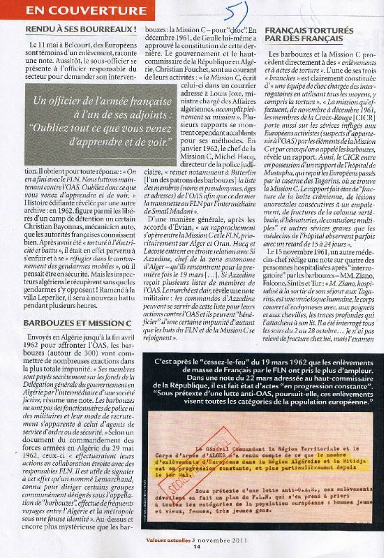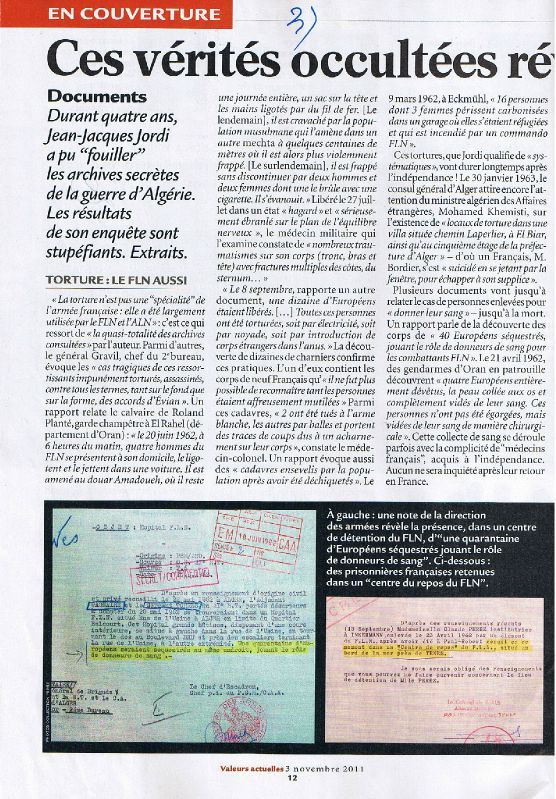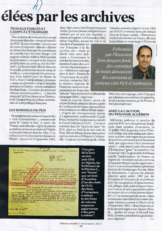 - Alors que les médias n’ont eu de cesse de rappeler durant 18 mois l’enlèvement de deux journalistes en Afghanistan et qu’un comité de soutien fut créé pour leur libération, nous rappelons également que depuis le 19 mars 1962, cela fera, au 30 septembre 2011, 18153 jours que des milliers de Français d’Algérie ont été enlevés dans la plus grande indifférence sans que les « bonnes consciences » de ce monde n’élèvent la moindre protestation.